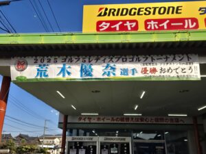この喜びを地域の皆様とも分かち合いたく、現在、タイヤパークフォレストにて優勝を記念した横断幕を掲げさせていただいております。
