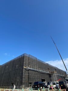 鉄骨のみだった前回のご報告から着実に工事が進み、堂々とした建物の姿が現れたことで、完成への実感がより一層高まっております。